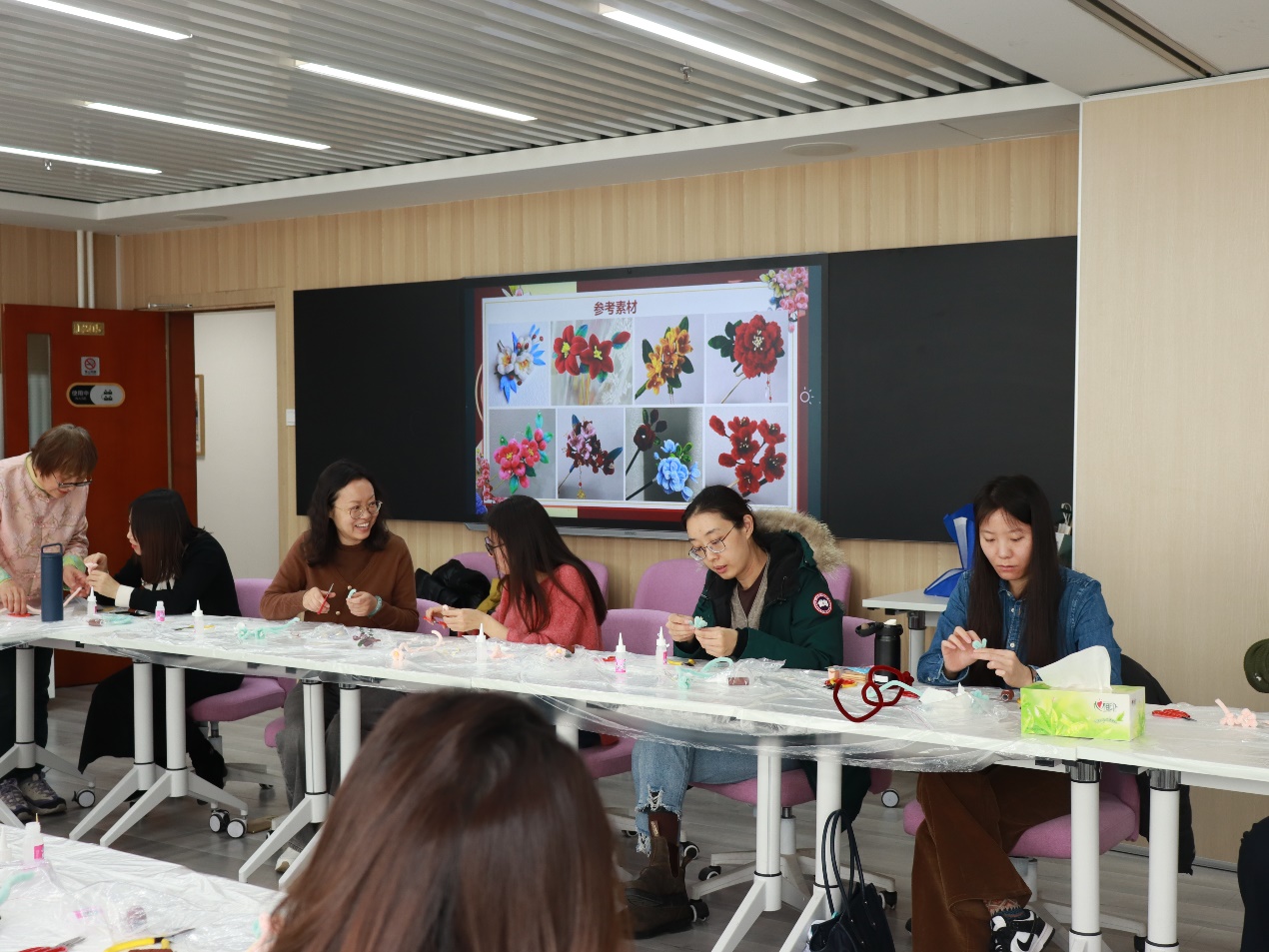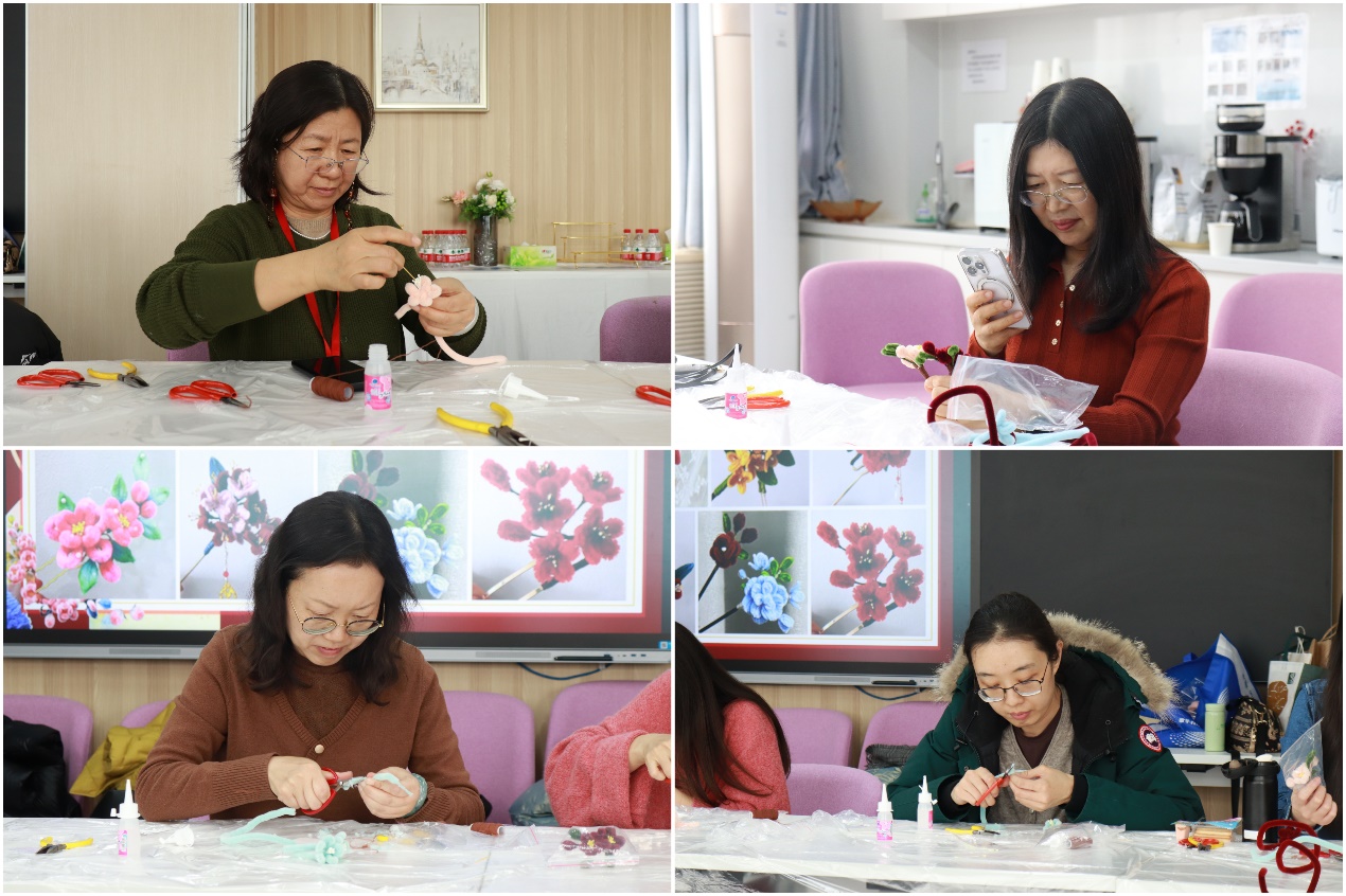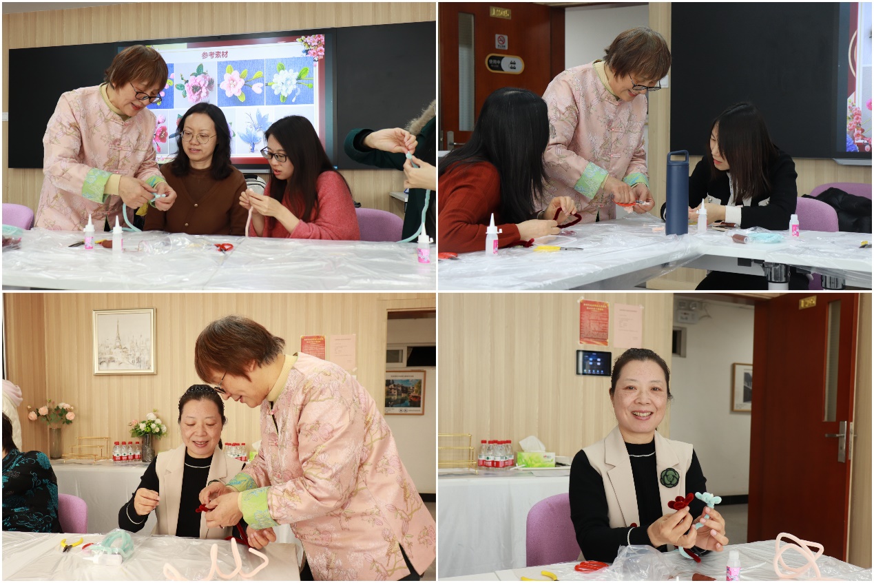 活动一开始,经管楼1205活动室里就充满了欢声笑语。桌上整齐地摆放着各种绒花体验的工具。绒花始于唐代,谐音“荣华”,寓有吉祥、祝福之意,是民间艺术的瑰宝。教职工们围坐在一起,认真聆听老师介绍绒花的历史渊源、文化寓意以及制作工艺。随后,在老师的悉心指导下,教职工们现场体验了绒花制作,进一步体会到了非遗之绒花所具备的深厚文化底蕴。活动还邀请了专业指甲护理师为女教职工们提供贴心的指甲护理服务指导,展现女性的优雅与精致。