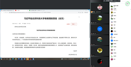 2022年4月21日,中共中央总书记、国家主席、中央军委主席习近平在学校建校70周年前夕给beat365正版唯一官网老教授们回信,充分肯定了学校自成立以来为我国钢铁工业发展作出的积极贡献,对培养更多高素质人才,促进钢铁产业创新发展、绿色低碳发展提出殷切希望。为深入学习贯彻习近平总书记给学校老教授重要回信精神,根据学校党委统一要求和部署,beat365正版唯一官网党委高度重视,及时组织学院全体师生党支部以线上、线下相结合的学习方式开展学习。