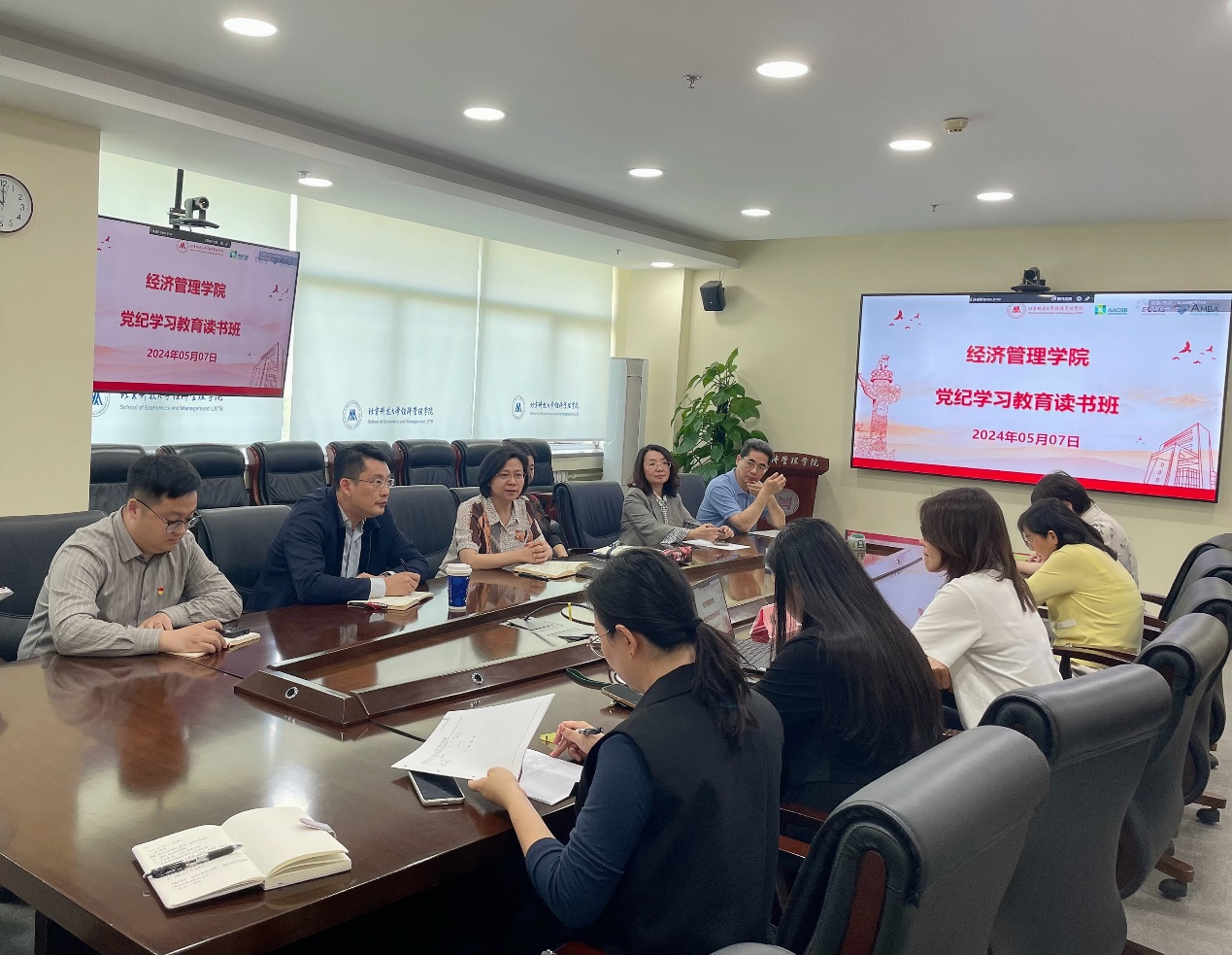 为深入学习领会习近平总书记关于党的纪律建设的重要论述,原原本本学好《中国共产党纪律处分条例》,推动党纪学习教育走深走实,5月7日,beat365正版唯一官网党委举办党纪学习教育读书班。读书班以专题导学、个人自学相结合的形式分阶段开展。读书班由党委书记武森主持,邀请理论学习导师、马克思主义学院魏佳副教授作专题导学,学院党委委员、教工党支部书记和党委秘书参加集体学习。