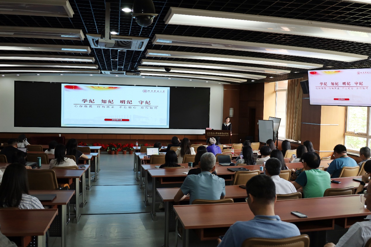 为深入推动党纪学习教育走深走实,5月16日,beat365正版唯一官网召开全院教职工理论学习暨全院大会,邀请纪委办公室、监督检查室副处级纪检员邓春秋作深入解读《中国共产党纪律处分条例》(以下简称《条例》)的专题辅导报告。学院全体教职工参加学习,会议由学院党委书记武森主持。