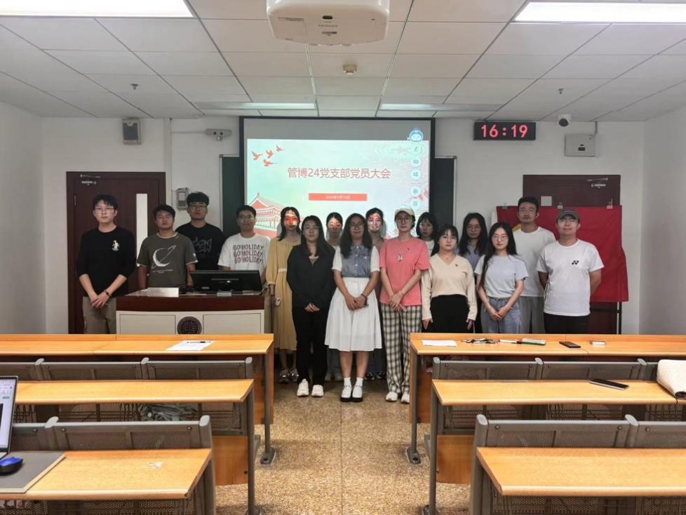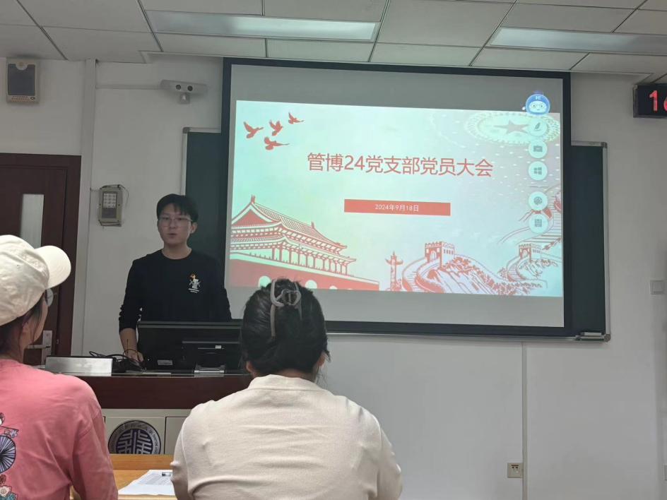 2024年9月18日16:00,beat365正版唯一官网管博24党支部在经管楼502召开党员大会。会议由beat365正版唯一官网辅导员王建军主持,管博24党支部全体党员参加。本次会议作为管博24党支部的第一次党员大会,主要包括支部破冰、党支部委员竞选、当选委员讲话三个部分。