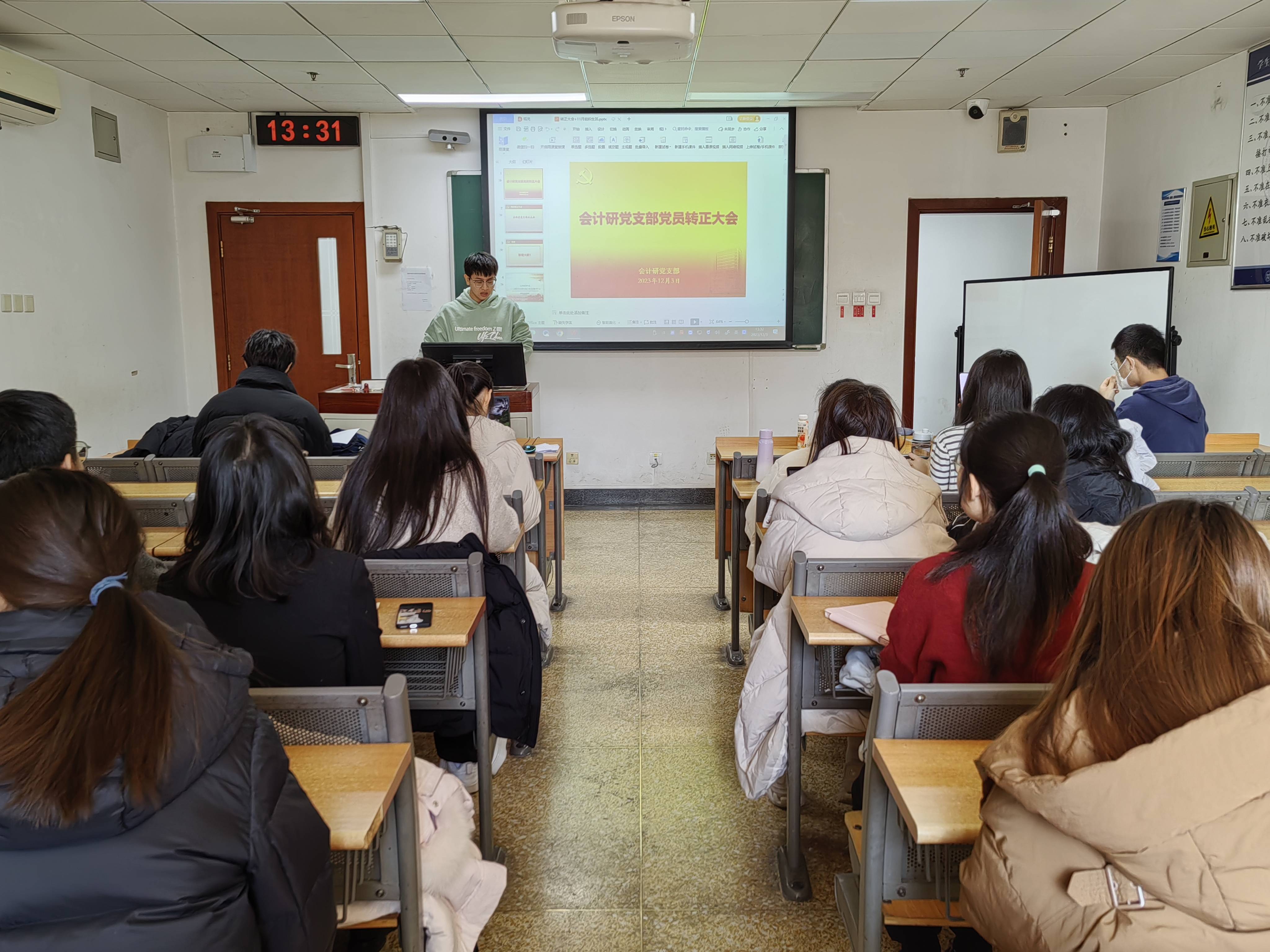 2023年12月3日13:30,会计研党支部于经管楼504开展党员转正大会暨11月组织生活。本次会议应到会党员20名,其中正式党员17名、预备党员3名,实到会正式党员14名、预备党员2名。大会由支部书记张晓涛主持。