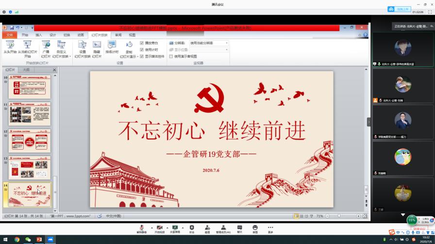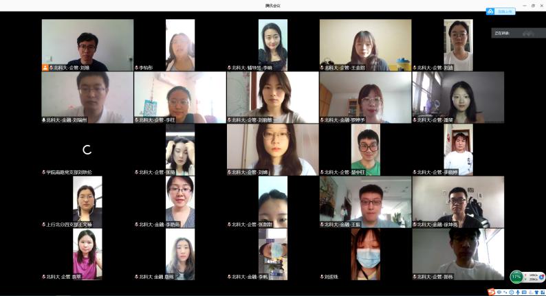 为深入学习贯彻习近平新时代中国特色社会主义思想,进一步提升、强化学生党组织的创造力、凝聚力与战斗力,7月6日上午10时,企管研19党支部与金融研19党支部、上海银行北京分行学院南路支行党支部、分行第四党支部联合举办了本学期第一场红色“1+1”系列共建活动。本次活动依托腾讯会议平台开展,会议由党支部书记刘维、刘瑞州主持,辅导员李响和支部全体成员参加。