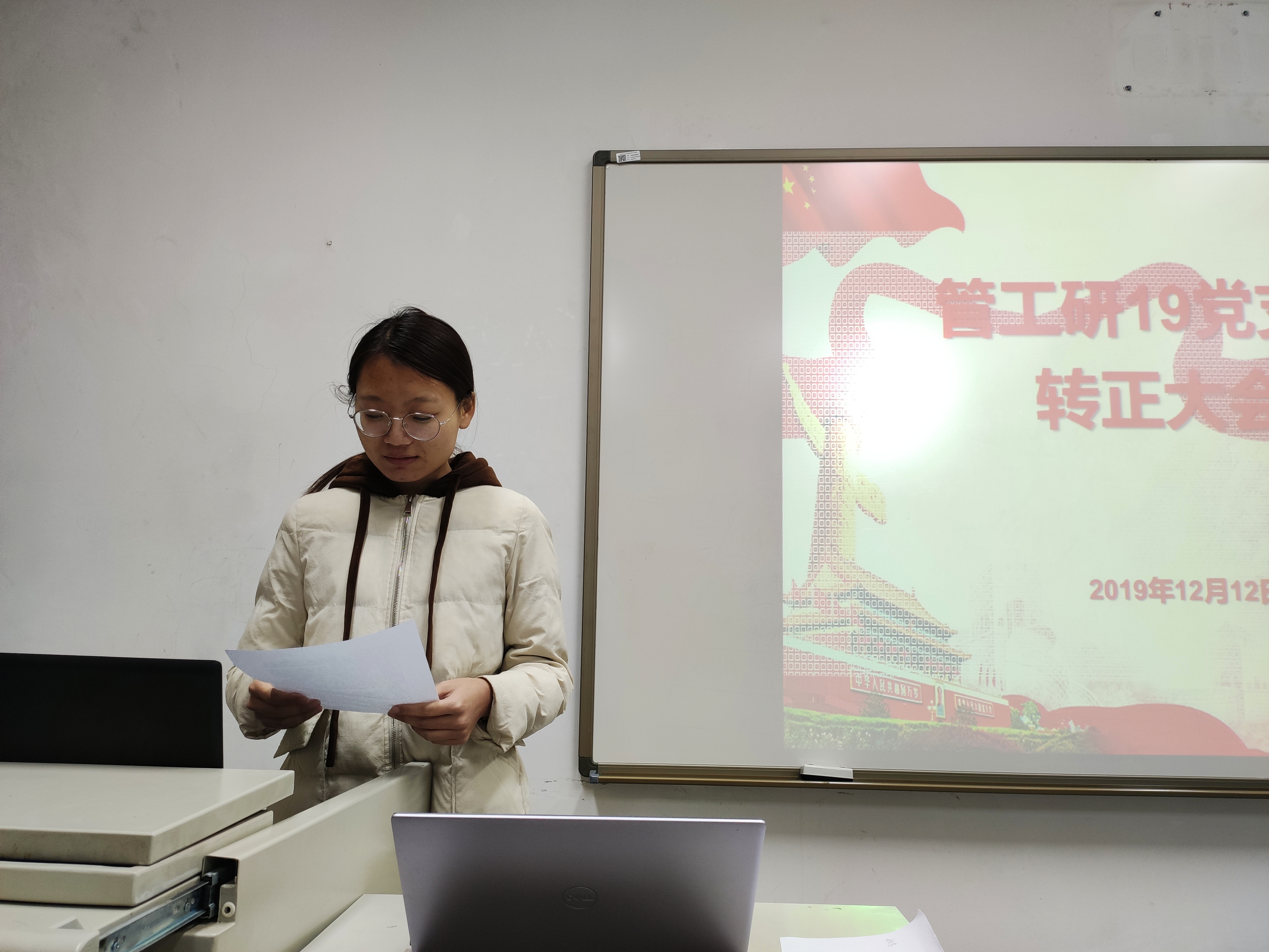 12月12日,东凌beat365正版唯一官网管工研19级党支部在管楼310顺利召开了中共预备党员转正大会暨“不忘初心、牢记使命”主题观影活动,党支部书记尹香婷主持本次活动。
