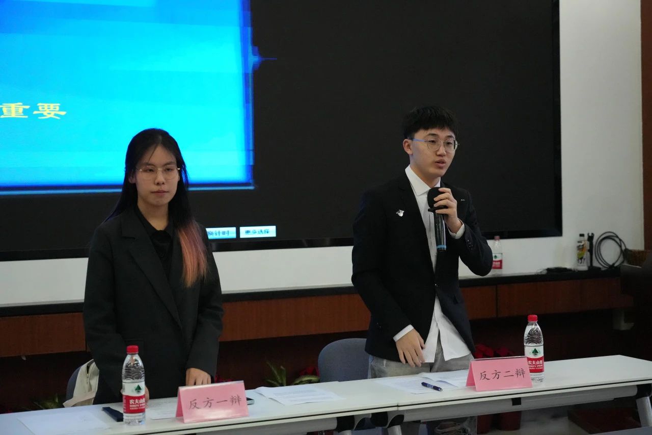 本次比赛采用“2V2”赛制,打破了传统的“4V4”辩论赛在院系设置、人员组织、沟通交流等方面的束缚,极大地提升了辩论赛的参与度。正方辩题为“如果人生是小说,人设更重要”;反方辩题为“如果人生是小说,情节更重要”。双方各有两名辩手进行辩论。