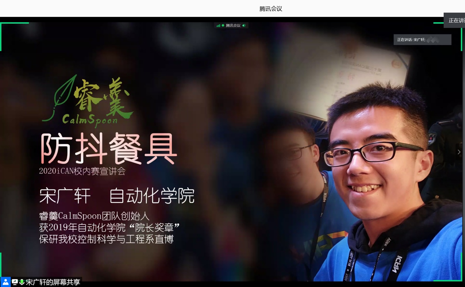 会议伊始,两支往届iCAN获奖团队进行经验分享。“睿羹CalmSpoon防抖餐具”队长宋广轩从项目简介、项目成长、参赛建议三个方面介绍防抖餐具团队的设计初衷、参赛过程和项目的成长历程,并从初创团队和有基础团队两个方面分享了宝贵的比赛经验。