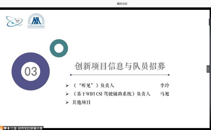 接下来,“听见”、“基于Wi-FiCSI的驾驶辅助系统”、“人体穴位识别系统”三支团队对自己项目信息和进展进行了简要说明,并发出了队员招募邀请。