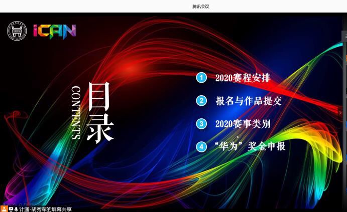 随后,胡秀军老师从2020iCAN赛程安排、报名与作品提交、2020赛事类别、“华为”奖金申报这四个方面对本次iCAN竞赛进行了详细的介绍。