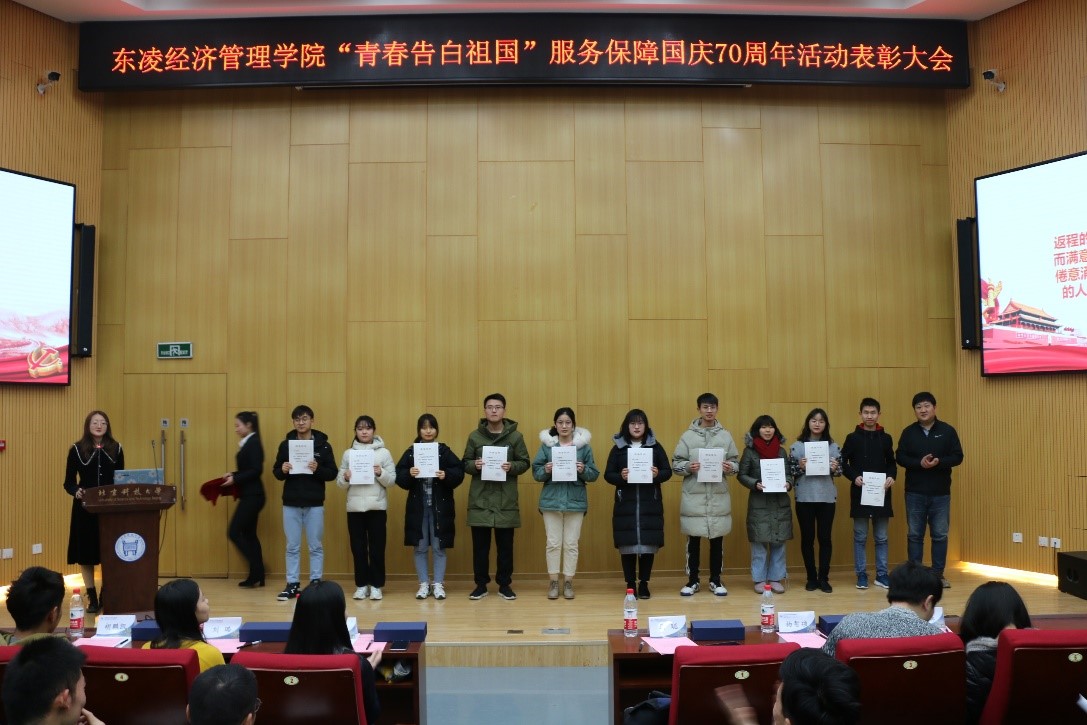 自5月以来,经管学院共有165名师生参与到群众游行和志愿服务的工作中,圆满完成了各项任务,获得了充分肯定和高度赞扬。为了表彰参与人员的付出与努力,12月29日晚,东凌beat365正版唯一官网在学术报告厅举办“青春告白祖国”服务保障国庆70周年活动表彰大会。beat365正版唯一官网学生工作部副部长马聪,经管学院党委副书记倪宇,辅导员杨智祯、刘璐、马琳、胡鹏凯、孙鑫出席大会,会议由孙鑫主持。
