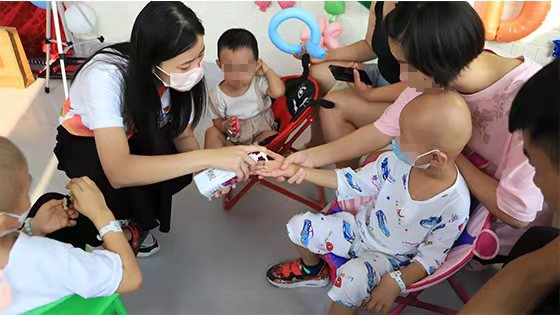 走病房给孩子们送礼物,为孩子们讲故事唱儿歌,教孩子们折飞机做灯笼,陪孩子们玩游戏过生日,每周一次的主题活动是本次志愿服务最重要的部分,也是工作中最难的地方。因为党员志愿者们面对的不是普通的生病孩子,而是患有恶性实体肿瘤的孩子们,手术、化疗让他们饱受痛苦与煎熬,也让他们的免疫力变得非常低,开展活动时变得更难。但是陪伴与爱是最强大的力量,志愿者们的出现给病房的孩子们带来了欢乐,给孩子们的家长带来了温暖。“初次看到孩子们时很心疼,也很难受,但与他们一起做游戏,不断的鼓励他们,看到他们从闷闷不乐到开心的笑出来,让我觉得所有的困难都可以克服,只想为他们再多做一些,哪怕对他们有一点点帮助,都值得”,志愿服务后一名志愿者说到。而这也是所有党员志愿者的心声,看着孩子们捧着心爱的礼物,对着生日蛋糕真诚的许愿,露出天真灿烂的笑容,就是活动最重要的意义,为孩子服务,为家长服务,就是这份工作勇担的使命。
