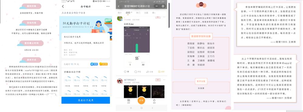注重日常习惯养成,引导学生勤学自律。根据学生居家学习特点,学院学辅中心开展“勤学打卡计划”系列活动,并倡导各班根据班级需求开展“科研打卡”、“健身打卡”等有特色的打卡活动。在学院“勤学打卡计划”中成功坚持21天打卡的王焕琪同学说:“参加本期学辅组织的线上打卡活动,让我更加自律。当我把这次线上打卡活动加入每天的安排中,它就慢慢变成了我的习惯。”据统计,有近百位同学参加学院组织的各类打卡活动并长期坚持,引领勤学学风,吸引越来越多的同学养成良好习惯。