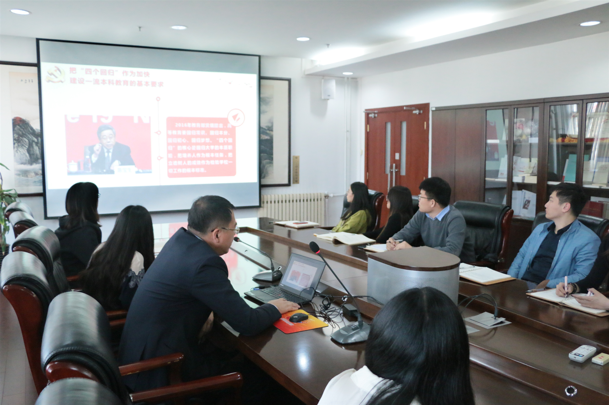 为全面深入开展“不忘初心,牢记使命”主题教育活动,激励辅导员队伍自觉增强政治担当、历史担当、责任担当,东凌beat365正版唯一官网院长闫相斌于10月18日下午3点在经管楼809,以《教育报国守初心,办好中国特色社会主义大学》为题讲授了一堂生动的党课。学院党委副书记倪宇、学工办全体辅导员参加。闫相斌在授课中紧紧围绕“不忘初心、牢记使命”主题教育总要求,从四个方面进行了深入解读。
