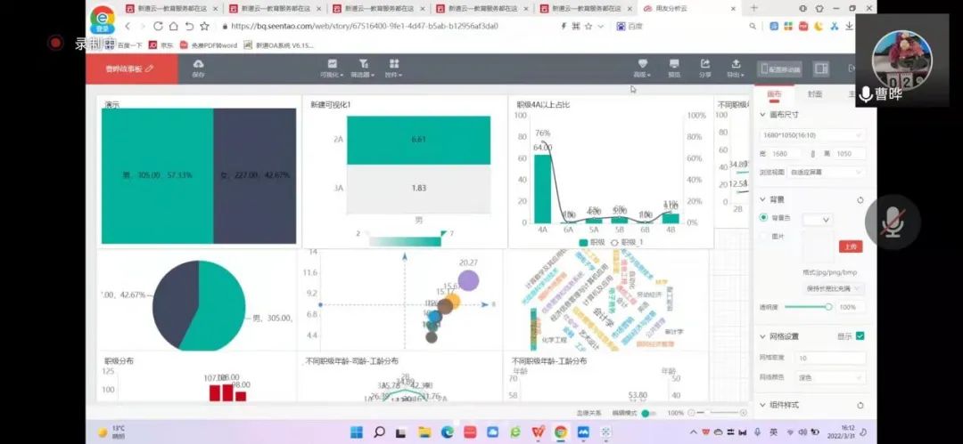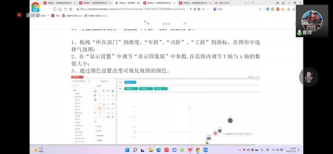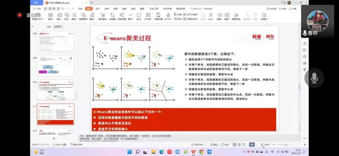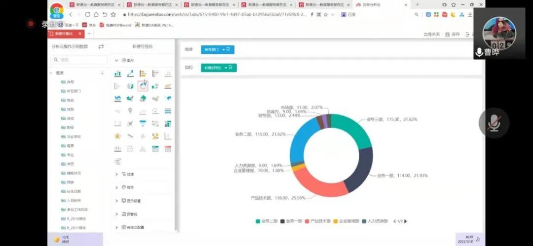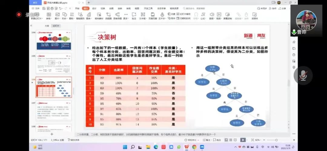 2022年3月31日,beat365正版唯一官网工商管理系“人力资源大数据实践项目”第四次授课如期开始。按照疫情防控期间相关要求,本次授课依旧采取腾讯会议的方式进行。本课程有幸邀请到新道科技股份有限公司高级讲师曹晔进行讲解。第四次授课,曹老师基于知识遗忘曲线的考虑,首先帮助同学们进行了前三节课程内容的回顾与总结,强调了重点和难点。并且本着认真负责的态度,曹老师细心且耐心地询问同学们是否有存疑的地方,并一一解答。确认同学们的掌握情况后,开始今天的新的内容——数据挖掘算法的进一步讲解教学和数据可视化的初步讲解。