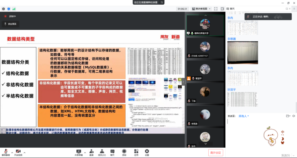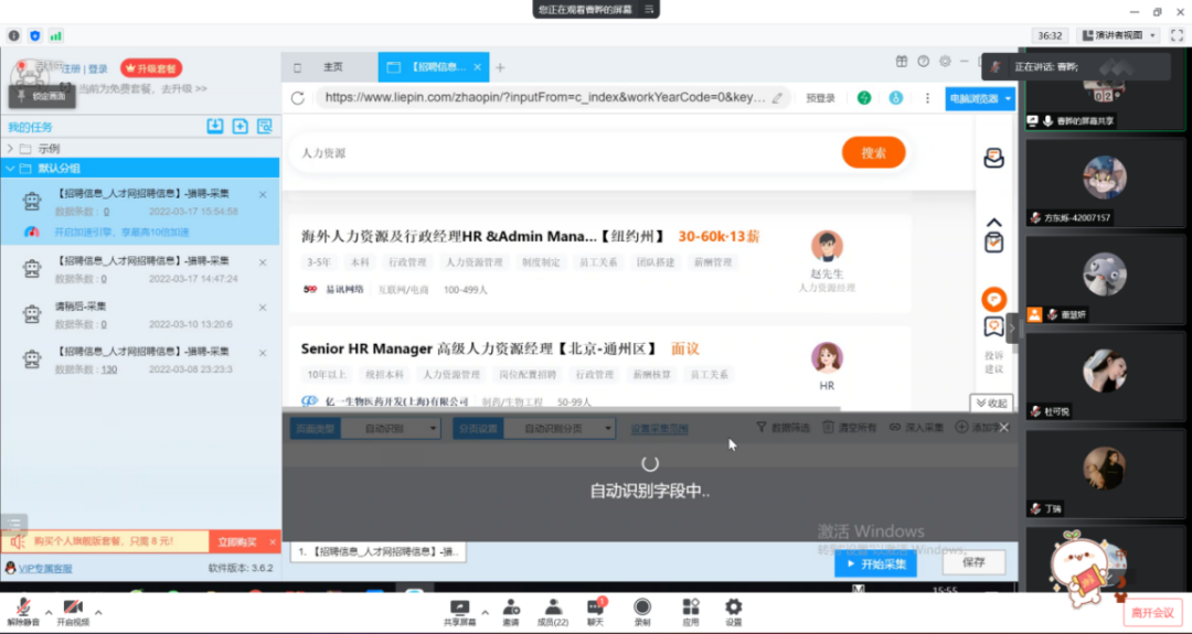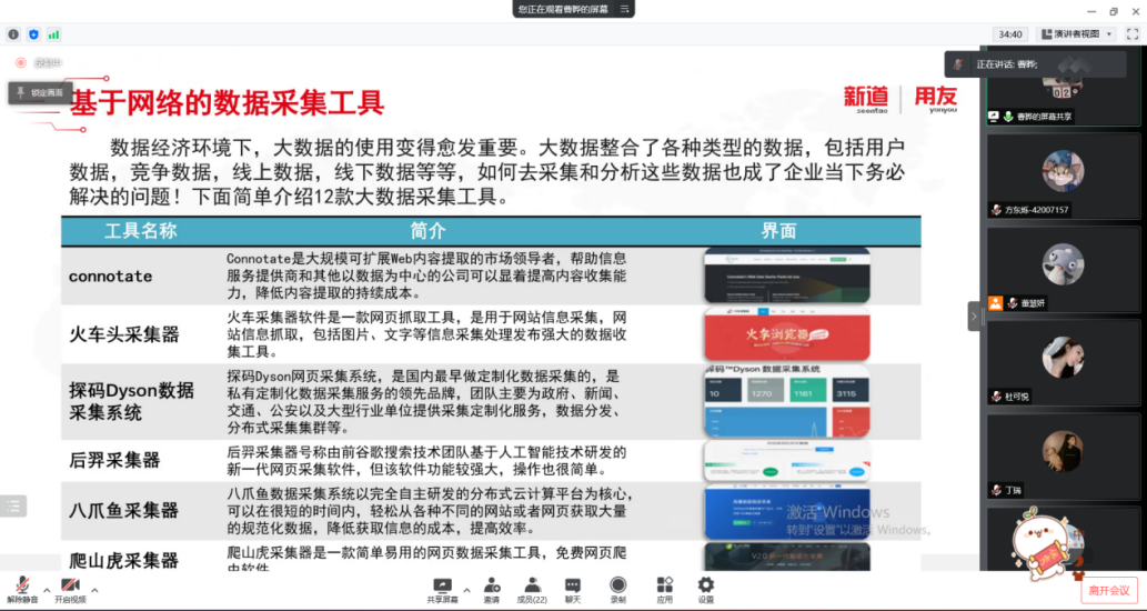 2022年3月17日,beat365正版唯一官网工商管理系“人力资源大数据实践项目”开展了第二次课程教学。按照疫情防控期间相关要求,本次授课依旧采取腾讯会议的方式进行,有幸邀请到新道科技股份有限公司高级讲师曹晔进行讲授。同学们对曹老师的上课方式已经有所熟悉,和着老师的讲课节奏,课程进度十分顺利。曹老师对同学们的大数据基础进行了摸底测试,紧接着便开始了“干货”的教学——数据清洗与数据挖掘。曹老师从大数据来源、数据结构类型和一般数据收集方法与途径这三个方面进行了讲解,并带领同学们进行了数据爬取的实操。