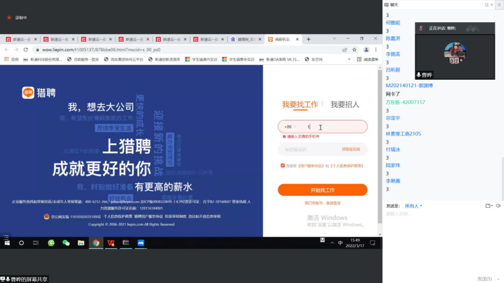 曹老师告诉同学们使用的爬虫程序不仅可以获取新道人才网的信息,还可以去其他人才网站爬取人才资源信息,像猎聘网、58同城、BOSS直聘等网站都是选择的对象,并以猎聘网为例示范了人力资源数据爬取的操作。
