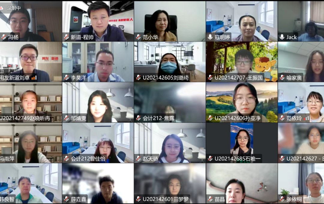 启动仪式后,来自用友公司的刘卓老师开始了第一讲的授课:财务大数据课程认知。通过丰富的数据及实例分析,刘卓老师为同学们具体介绍了大数据的应用场景、数智驱动下企业的财务活动现状、数智转型带来的人才思考及数字财务人才能力画像等内容。授课过程中,同学们踊跃与老师在线互动,积极参与课堂讨论。本次基础课程的生动讲授也激发了同学们对财务大数据的极大学习兴趣。