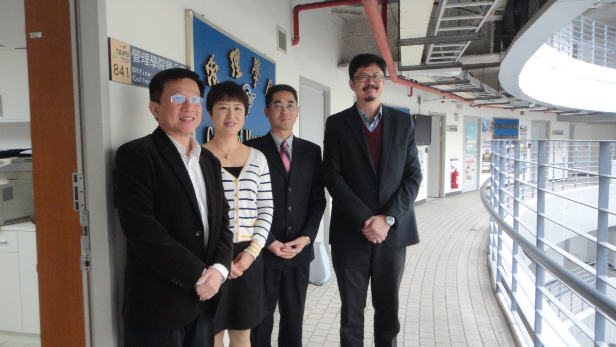 对台北科技大学校园历史以及管理学院文化气息进行切身体验之后,何枫副院长、黄晓霞教授准时拜访了台北科技大学管理学院,对方院长邱垂昱教授和前任院长翁�舜教授在院长办公室841会见了我院代表。
