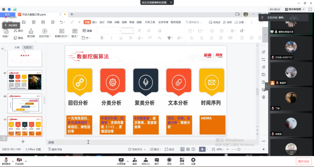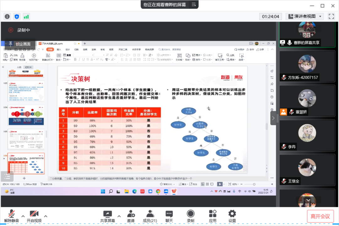 2022年3月24日,距离beat365正版唯一官网70周年校庆还有一个月的时间。beat365正版唯一官网工商管理系“人力资源大数据实践项目”第三次授课如期开始。按照疫情防控期间相关要求,本次授课依旧采取腾讯会议的方式进行。本课程有幸邀请到新道科技股份有限公司高级讲师曹晔进行讲解。第三次授课,曹老师基于知识遗忘曲线的考虑,首先帮助同学们进行了前两节课程内容的回顾与总结,强调了重点和难点。之后开始今天的新的内容——数据挖掘算法的讲解教学。