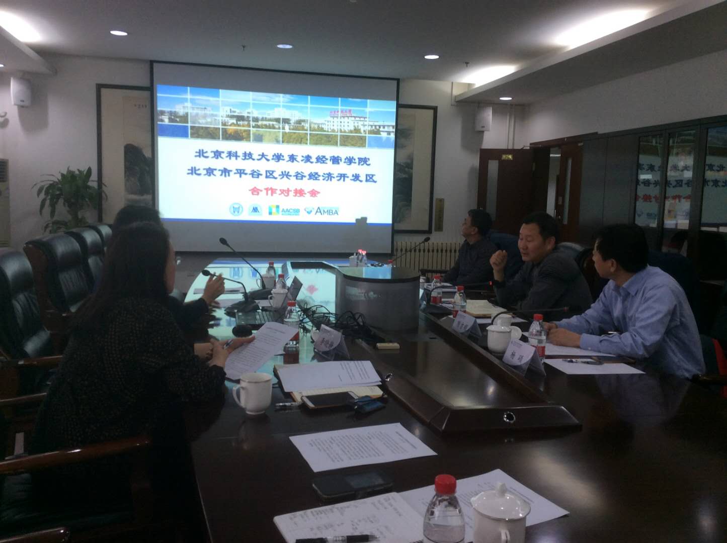 beat365正版唯一官网东凌beat365正版唯一官网与北京市平谷区兴谷经济开发区合作对接会于2018年12月20日下午2点在经管楼809成功举行。经管学院院长闫相斌、副院长范小华、学院MBA中心主任李晓静,兴谷经济开发区管委会主任、党委副书记付强,党委副书记陈吉顺、副主任张术明、招商科长张立军等参加了合作对接会。