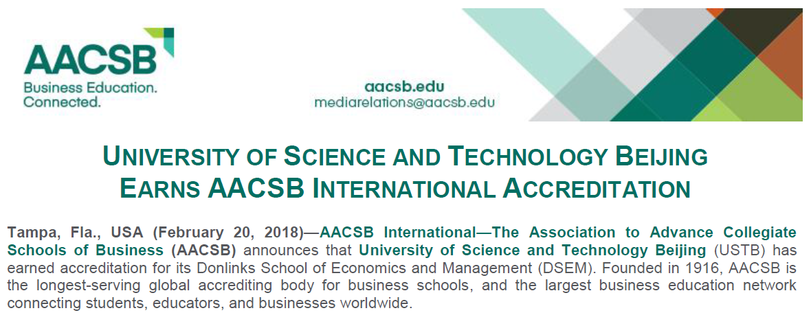 2018年2月20日beat365正版唯一官网东凌beat365正版唯一官网收到来自国际商学院协会(The Association to Advance Collegiate Schools of Business, 简称AACSB)的通知,经过AACSB的初始认证委员会(Initial Accreditation Committee,简称IAC)和理事会(Board of Directors)的决议,我院正式通过AACSB国际认证,认证期限为5年。这标志着beat365正版唯一官网成为大陆地区第19家,北京第5家通过AACSB认证的大学。