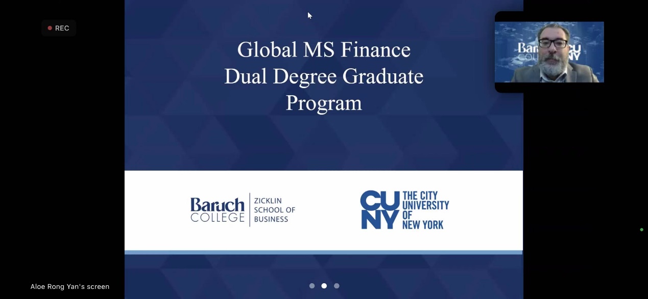 2024年1月8日晚,beat365正版唯一官网与纽约市立大学巴鲁克分校杰克林商学院合办的硕士双学位项目线上宣讲会顺利举办。宣讲会邀请杰克林商学院外联部主任Matt LePere教授和国际项目专员Aloe Rong Yan老师进行项目介绍。我院国际合作与交流办公室赵霞主任、王频频老师以及来自学硕和专硕项目的三十余名学生参与了此次宣讲会。