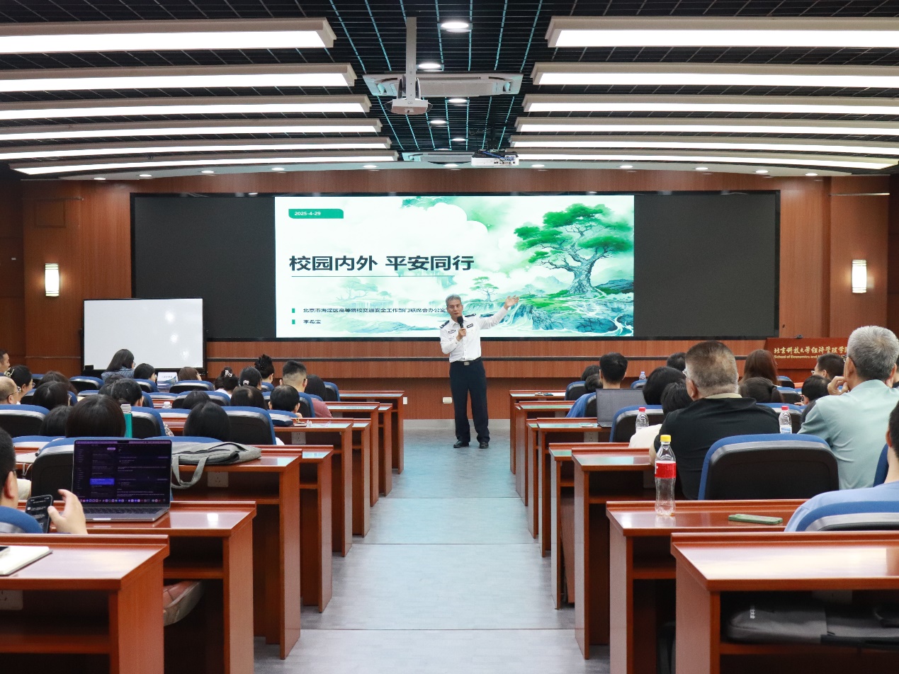会议伊始,学院邀请海淀区高等院校交通安全工作部门联席会办公室主任、海淀交通支队二级高级警长李希宝警官为全体教职工带来了“校园内外·平安同行”交通安全专题讲座。李警官结合交通事故案例视频,提醒老师们在走路、骑车、开车的过程中要时刻遵守交通规则,防止意外事故。