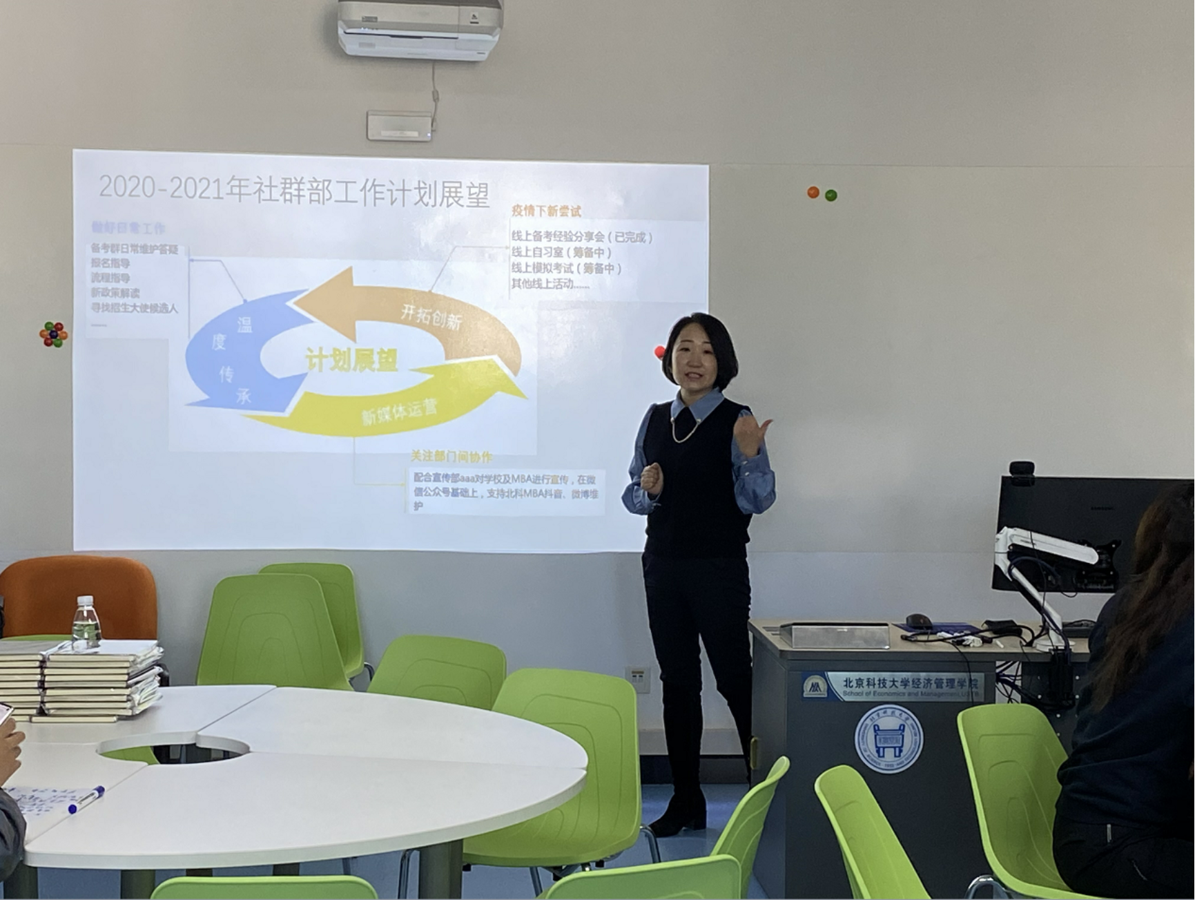 林广宇详细介绍了社群部未来的工作规划——传承、答疑指导、创新。打造MBA形象,让考生感受到北科的温度和力量。
