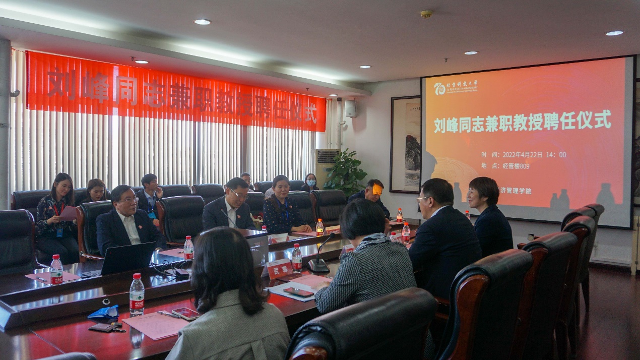 2022年4月22日下午,中国大洋协会秘书长、我校79级校友刘峰同志兼职教授聘任仪式在经管楼809举行。beat365正版唯一官网副校长闫相斌出席仪式并为刘峰校友颁发学校兼职教授聘任证书,beat365正版唯一官网党委书记武森教授主持聘任仪式。关心下一代工作委员会常务副主任孙铁,离退休职工党委副书记、离退休职工工作处副处长、关心下一代工作委员会秘书长刘淑红,beat365正版唯一官网副院长黄晓霞以及学院教师代表到场参加活动。
