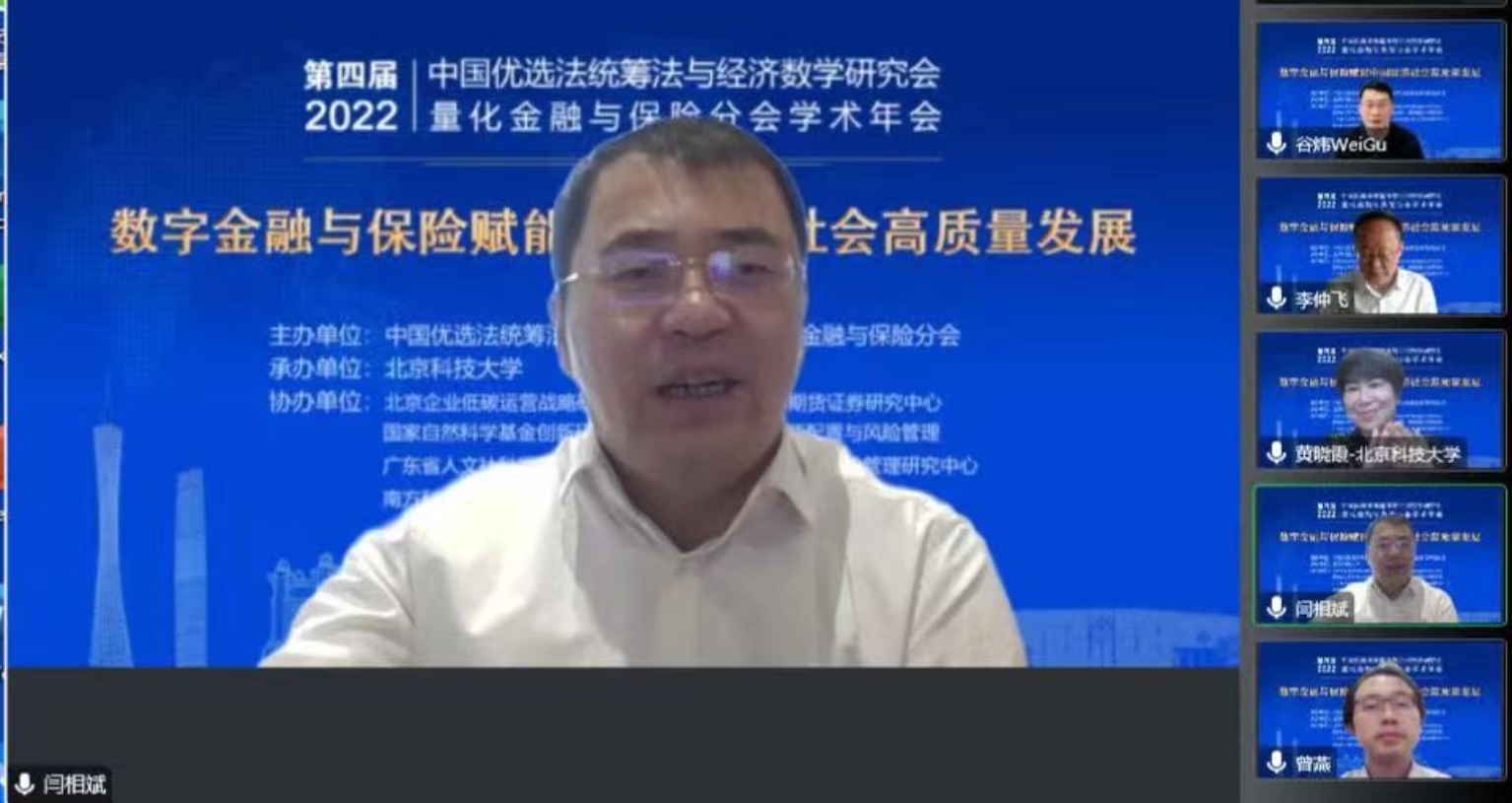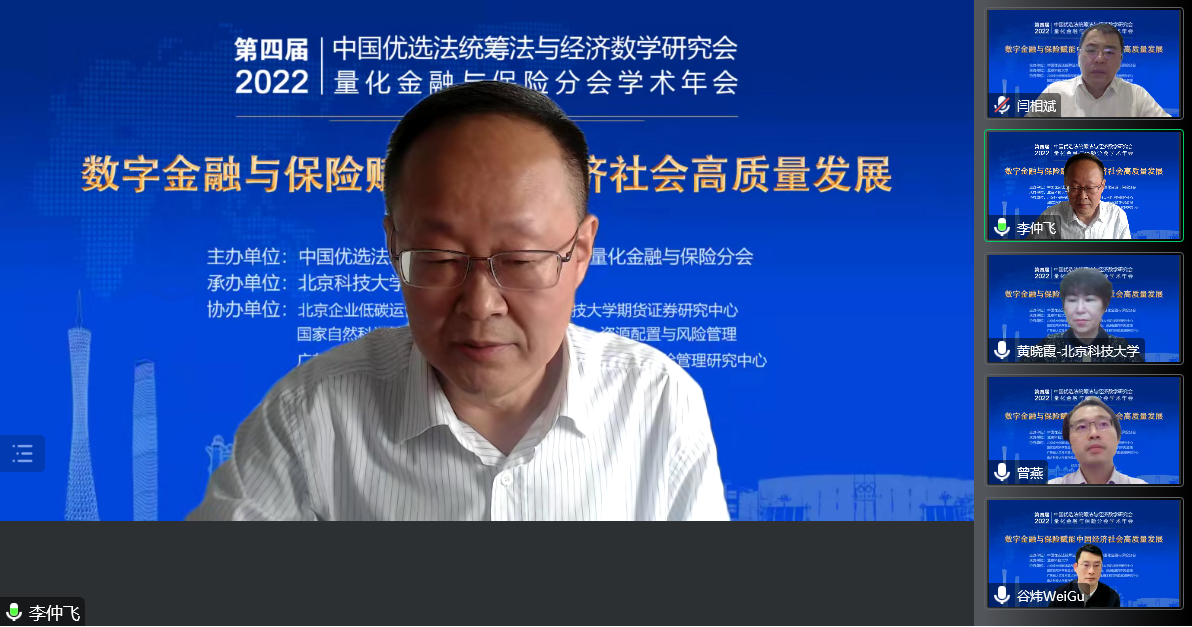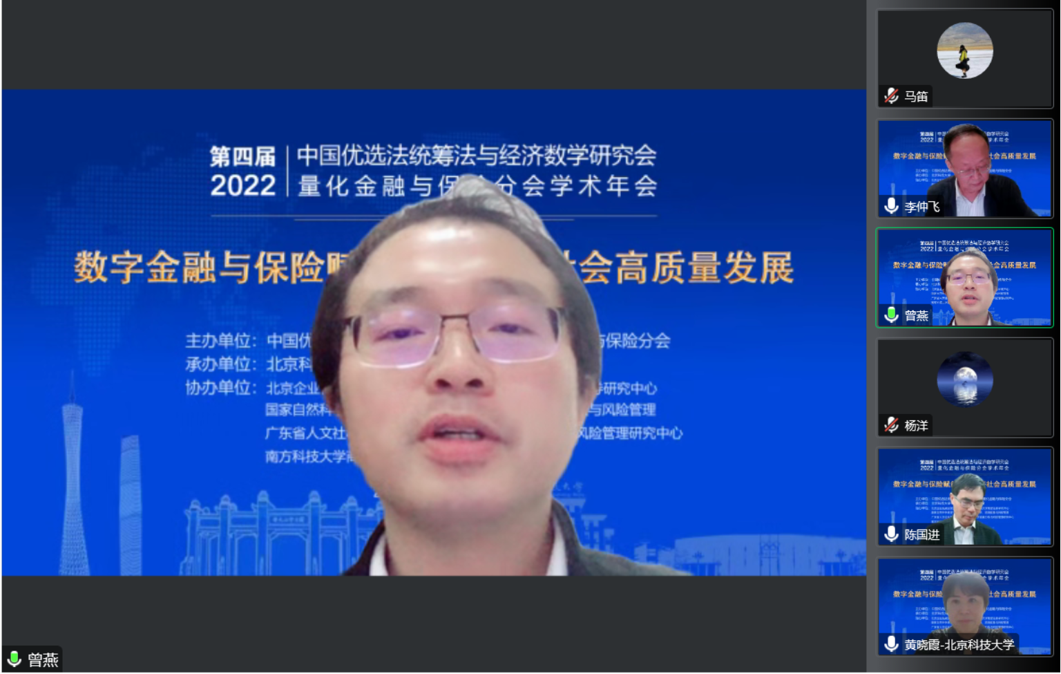 2022年12月3日至4日,第四届(2022)双法研究会量化金融与保险分会学术年会在线胜利召开。本届年会由中国优选法统筹法与经济数学研究会(简称中国“双法”研究会)量化金融与保险分会主办,beat365正版唯一官网承办,北京企业低碳运营战略研究基地、beat365正版唯一官网期货证券研究中心、国家自然科学基金创新研究群体:金融创新、资源配置与风险管理、广东省人文社科重点研究基地:中山大学金融工程与风险管理研究中心,南方科技大学商学院金融系协办。