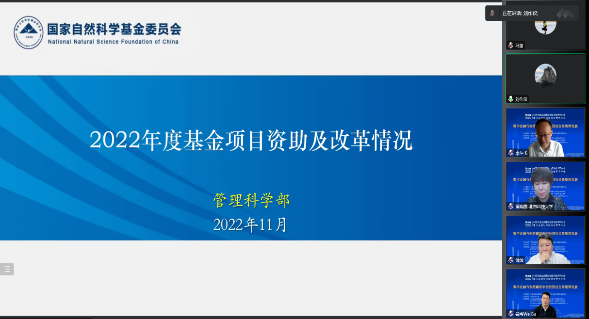 开幕式后,由国家自然科学基金委管理科学部副主任刘作仪、哥伦比亚大学的周迅宇教授、中国科学院的汪寿阳院士和中国科学院系统科学研究所副所长杨晓光研究员作大会报告。首先,刘作仪主任作了题为《2022年度基金项目资助及改革情况》的大会报告,详细介绍了2022年度管理学部基金资助情况和改革情况。然后,周迅宇教授作了题为《ReinforcementLearninginContinuousTimewithFinancialApplications》的大会报告,介绍了无模型连续时间强化学习及其在金融资产管理中的应用。上半场大会报告由大会主席李仲飞理事长主持。汪寿阳教授作了题为《加密货币的几个问题》的大会报告,从比特币挖矿谈起,通过几个案例来分析数字经济时代风险管理的一些新问题,并针对这些新问题,提出新理论、新方法与新技术,促进数字经济风险管理理论的研究与发展。最后,杨晓光研究员作了题为《数字经济的内在逻辑》的大会报告,报告指出了从卖方经济到买方经济的人类行为的变化,使得互联网和信息技术全面赋能经济各个环节,并阐述了数字经济的经济产出中市场和数据要素的重要性。下半场大会报告由beat365正版唯一官网副院长黄晓霞教授主持。大会报告内容丰富、精彩纷呈,为参会人员呈现了一场量化金融与保险前沿研究的思想盛宴。大会报告期间通过腾讯会议参与大会报告学习讨论的人数达到了300上限,同时还有近500人通过线上直播的方式参与大会报告的学习。