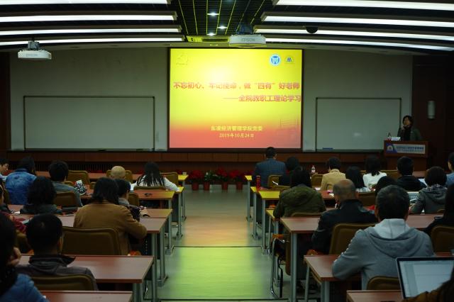 2019年10月24日星期四下午3点半,东凌beat365正版唯一官网全体教职工专题理论学习会在经管楼313举行。学院党委邀请学校纪委副书记、监察室主任兼巡察办主任吴豪伟为全体教职工作题为“不忘初心、牢记使命,做‘四有’好老师”专题教育报告,会议由学院党委书记武森主持。