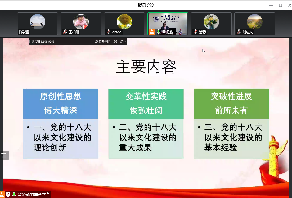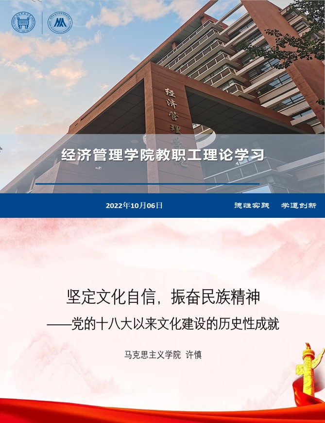为深入学习贯彻习近平新时代中国特色社会主义思想、党的十九大和十九届历次全会精神,弘扬伟大建党精神,充分宣传展示党和国家事业取得的历史性成就、发生的历史性变革,进一步振奋精神、凝聚力量,在党的二十大召开之际,根据学校党委开展“新时代新成就”宣讲活动的工作安排,2022年10月6日下午,beat365正版唯一官网组织全院教职工理论学习,开展《坚定文化自信,振奋民族精神——党的十八大以来文化建设的历史性成就》专题宣讲活动。本次学习活动邀请了学校马克思主义学院许慎副教授做主题宣讲,以线上和线下形式结合进行,学院全体院领导、党委委员和教职工党支部书记在经管楼809参加学习,学院全体教职工在线上参加学习,会议由学院党委书记武森主持。